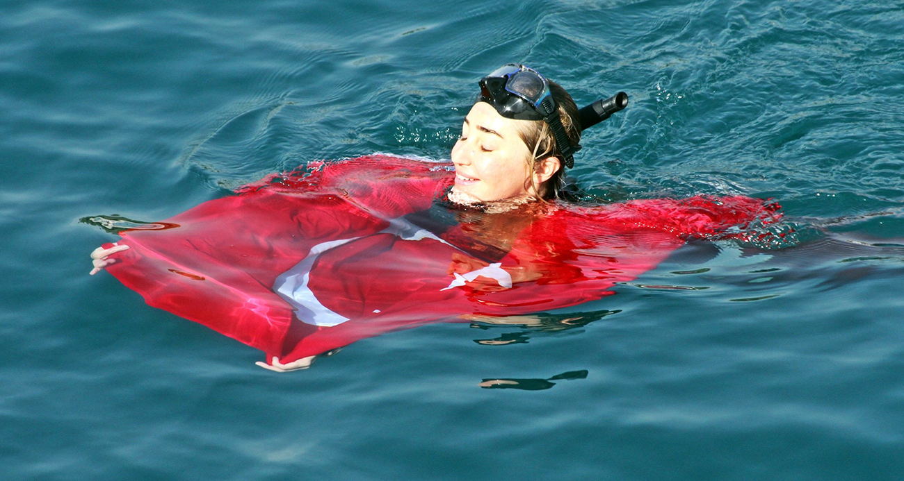 Dünya rekortmeni Şahika Ercümen Cumhuriyet için Türk bayrağını denizde dalgalandırdı