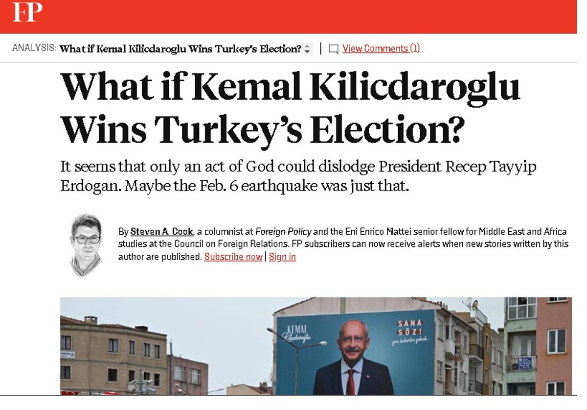ForeIgn Policy'de yapılan değerlendirmeye göre; “… Yalnızca Tanrının bir eylemi Erdoğan'ı yerinden edebilir gibi görünüyor. Belki de 6 Şubat depremi tam da buydu” tespiti yapıldı. Cook, şu soruya yanıt aradı: “Kılıçdaroğlu kazanırsa, bu durum Türk siyaseti ve dış politikası için ne anlama gelir?” Sorunun yanıtına bakalım: