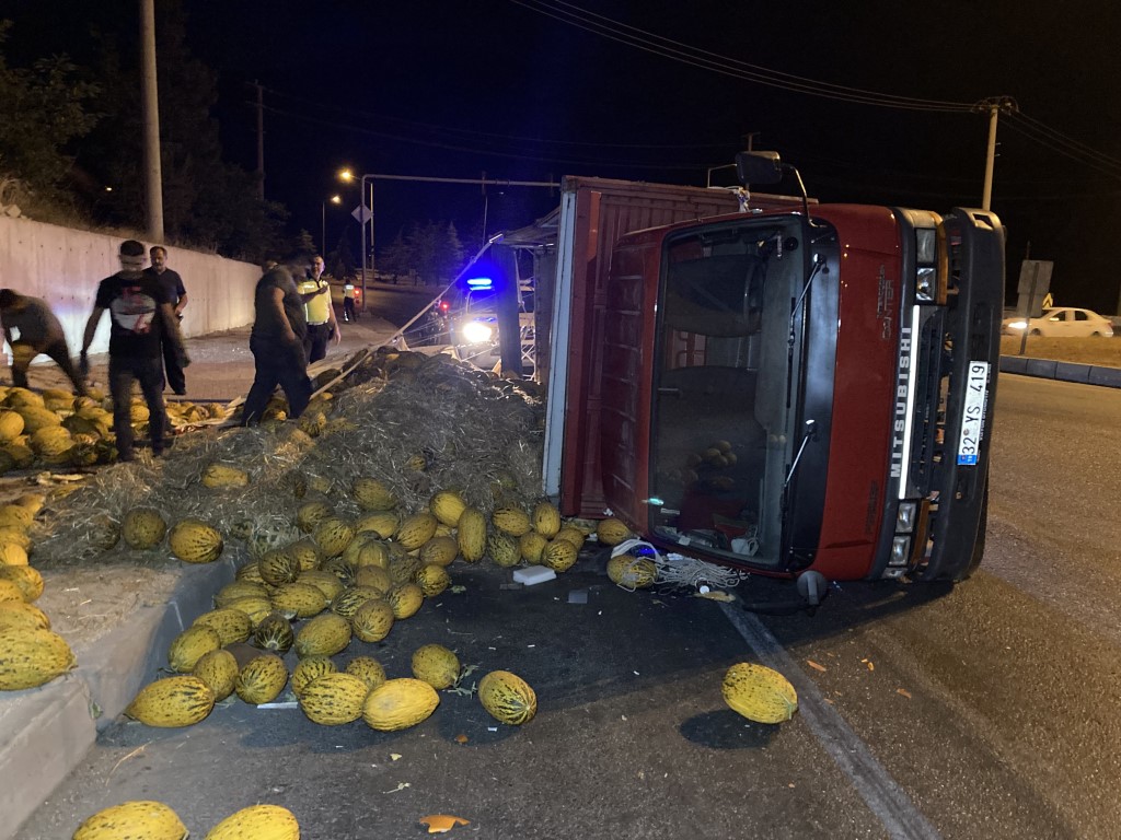Virajı alamayan kavun yüklü kamyon devrildi trafikte uzun araç kuyruğu oluştu