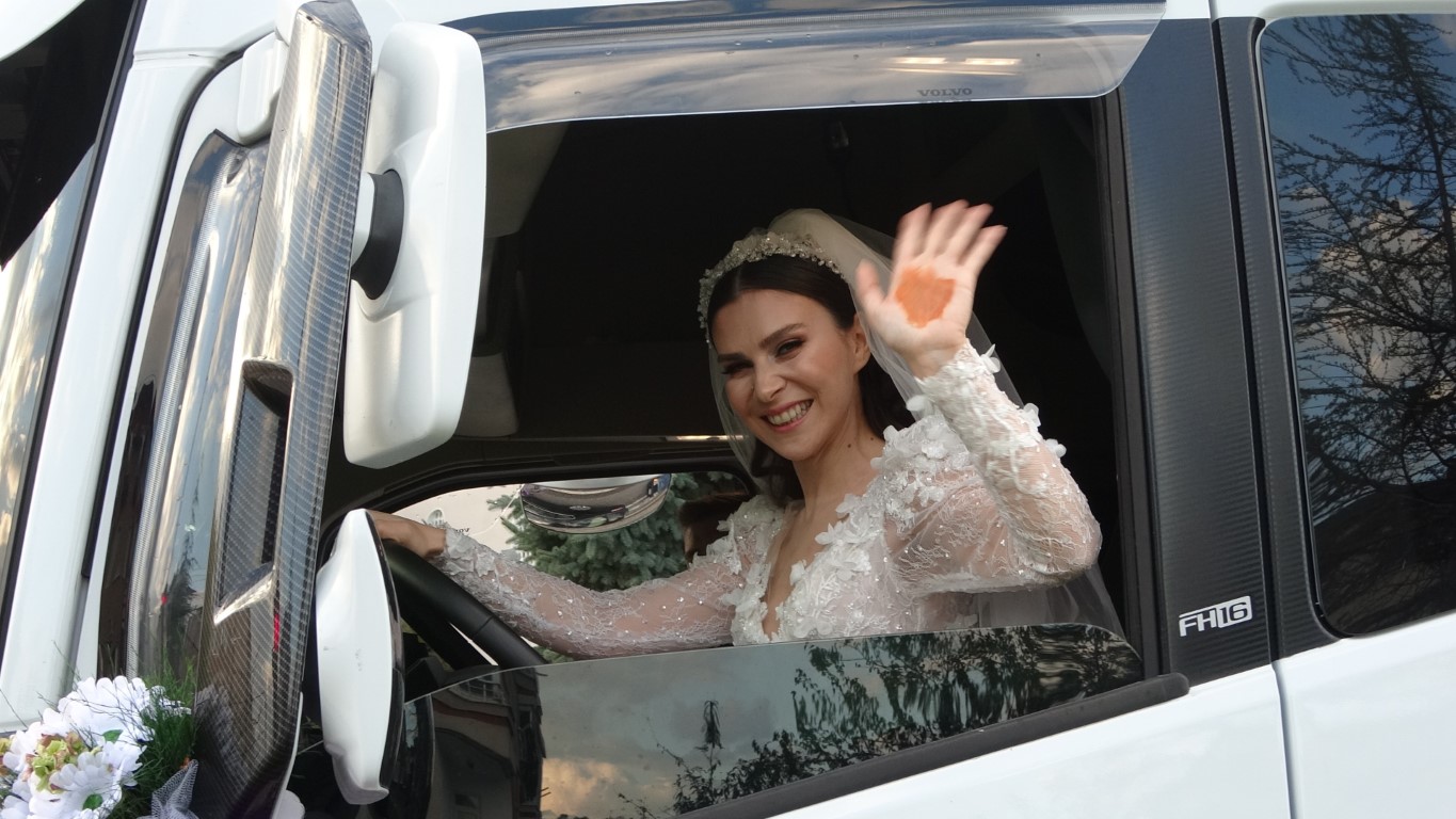 Tır sürücüsü çiftin efsane düğünü Gelini direksiyonda görenler şaşkına döndü