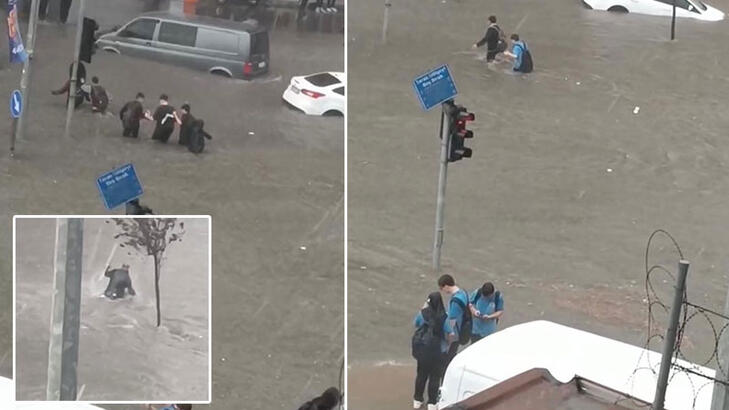 Başakşehirdeki selden geriye kalan çarpıcı görüntü Liselilerin tehlikeli geçişi