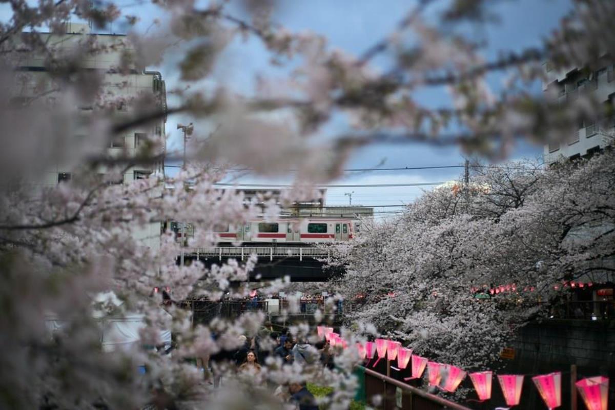 Japonyada Fenerlerle Süslenen Kiraz Çiçeklerinin Tabloyu Andıran Manzarası
