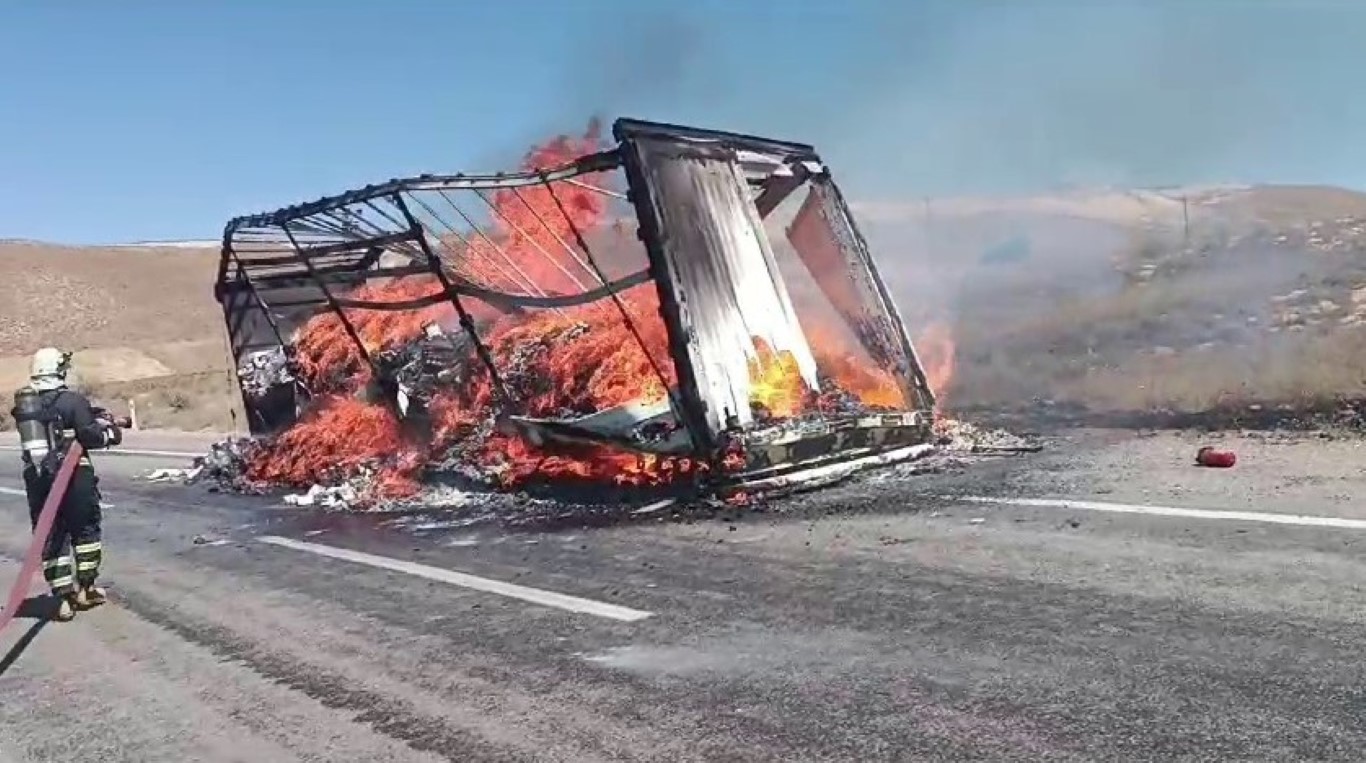 Çocuk bezi ve ıslak mendil yüklü dorse alev alev yandı
